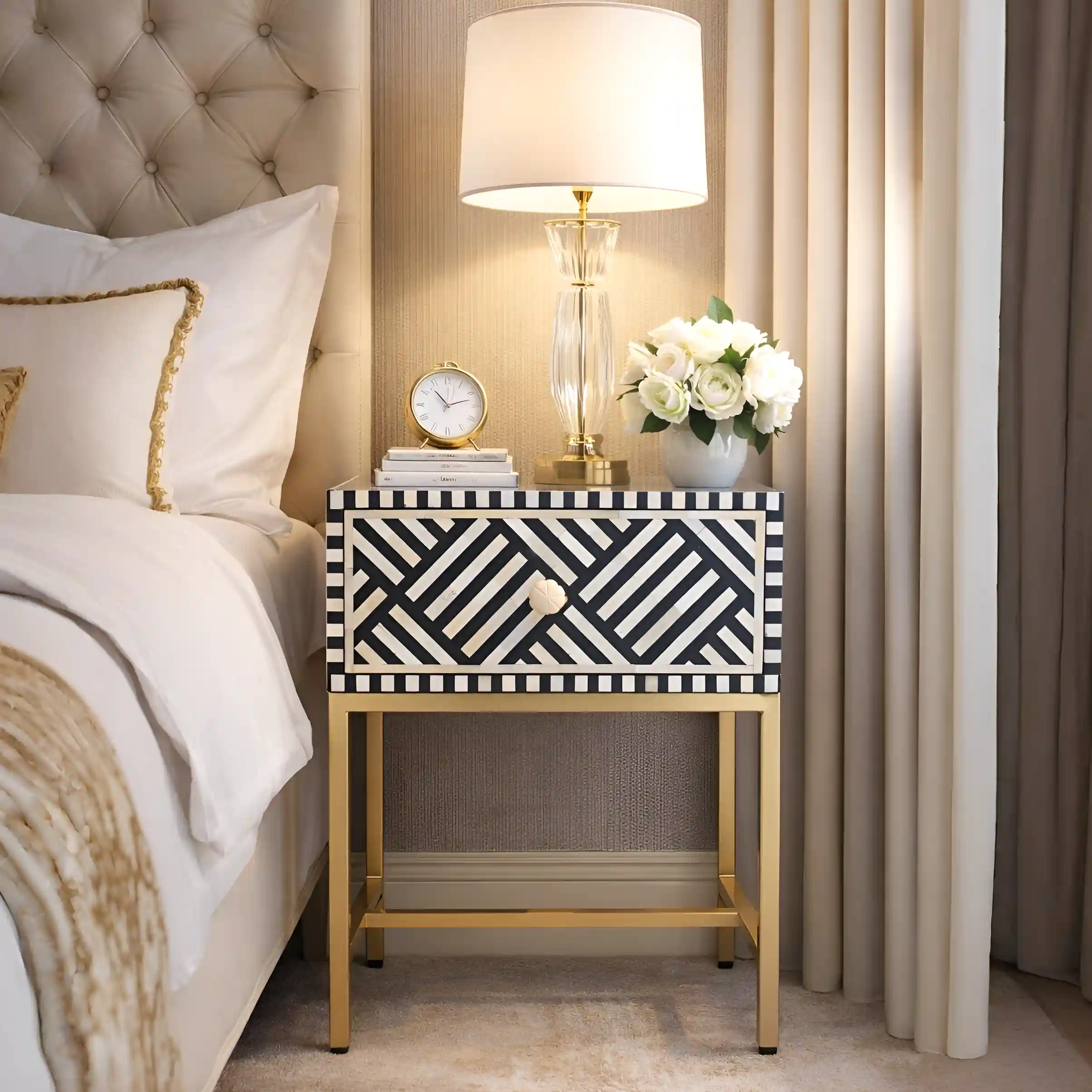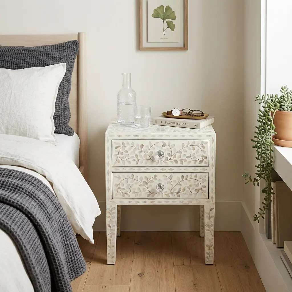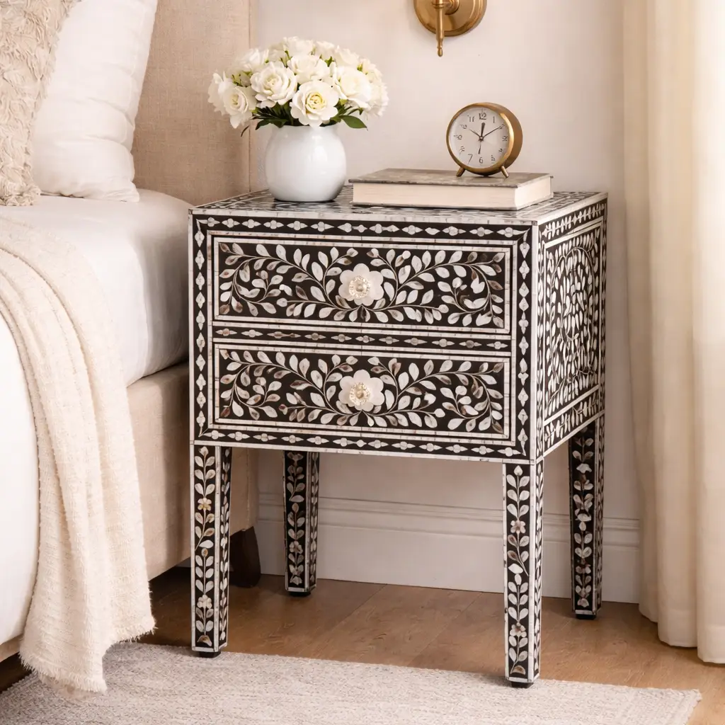 The Indigo-Diamond Bone Inlay Bedside Table