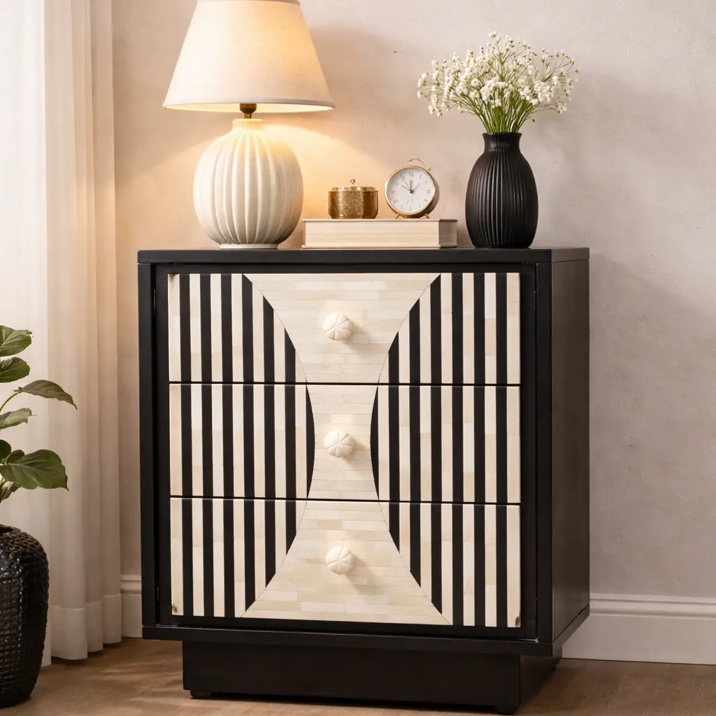 THE GEOMETRIC SCALE BONE INLAY COMMODE BEDSIDE