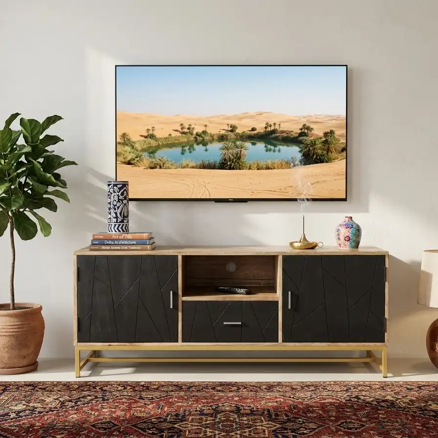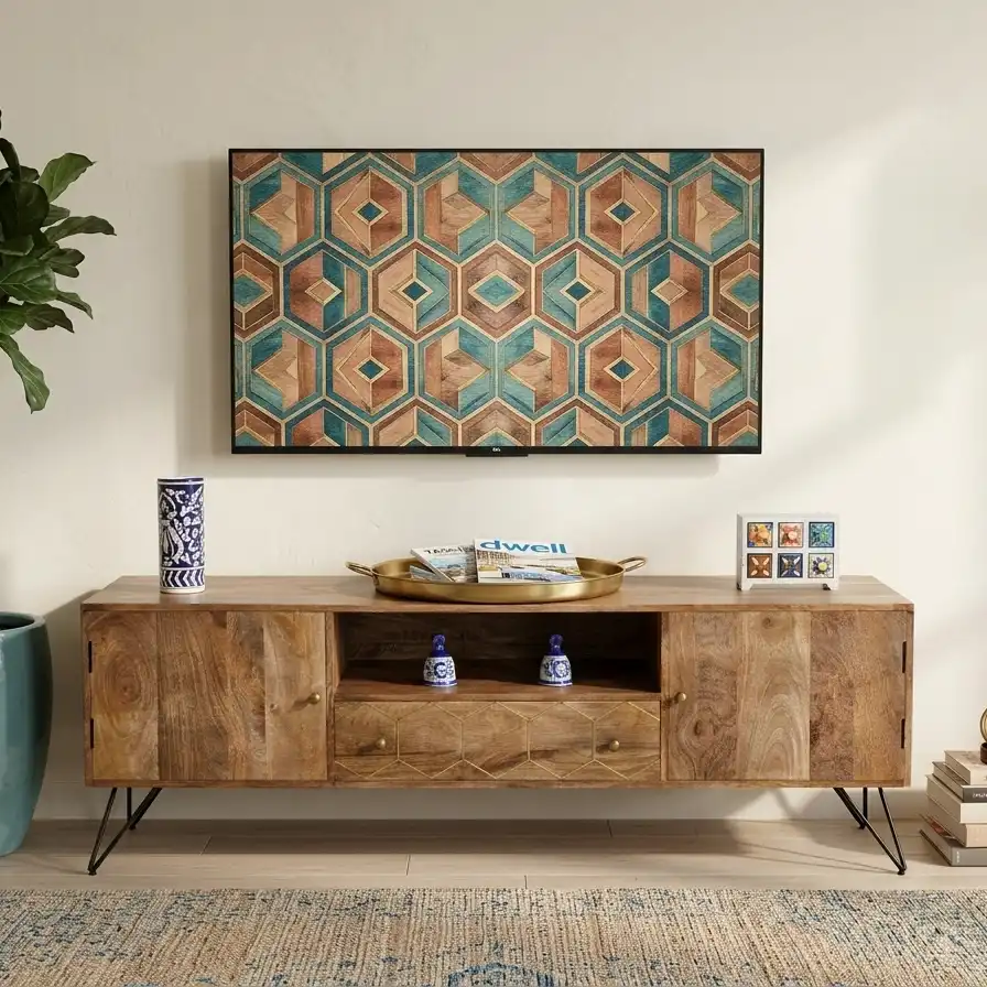 "Hala" Geometric Mixed-Tone TV Unit / طاولة تلفزيون "هلا" بالخشب والنقوش
