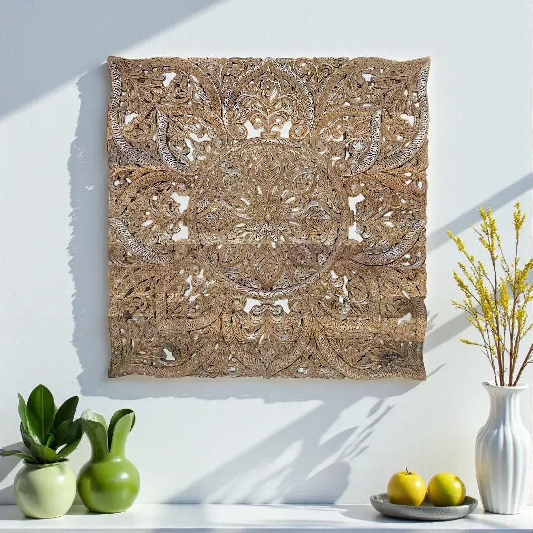 Natural Wood Floral Mandala Carving | Square Panel Wall Art